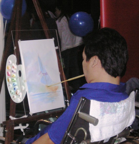 I had the privilege of watching them at work. It was a public “demonstration” so I knew they already have a subject in mind when they started. Assistants helped them set up the easel (for mouth painter Jovy), chair (for foot painter Jason), watercolor paints, and palettes. Once they were comfortable, they began the journey, taking the audience with them stroke by skillful stroke. Jovy took us sailing with his breezing stroke to reveal a lone sailboat in an open sea. Jason stayed behind, waving at us with his calming brush of an idyllic countryside scene. At the end of this journey, which took us all less than an hour, both Jovy and Jason signed their masterpieces with their mouth and foot, respectively.