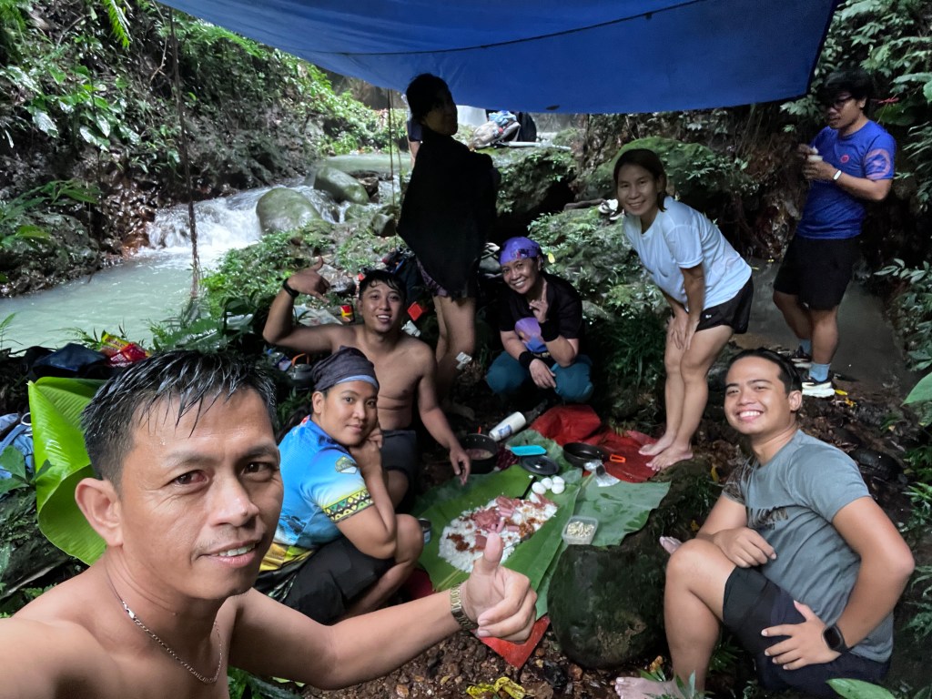 By 11AM, we arrived at the falls. The current was strong and the water cold. Only a few of us were brave enough to swim in the cold water, while the rest of us were just happy to soak our tired feet and legs. They set up a tarp and banana leaves in a spot where we had a mini boodle fight for lunch. We stayed until 2PM before heading to a second peak named Pataguim.