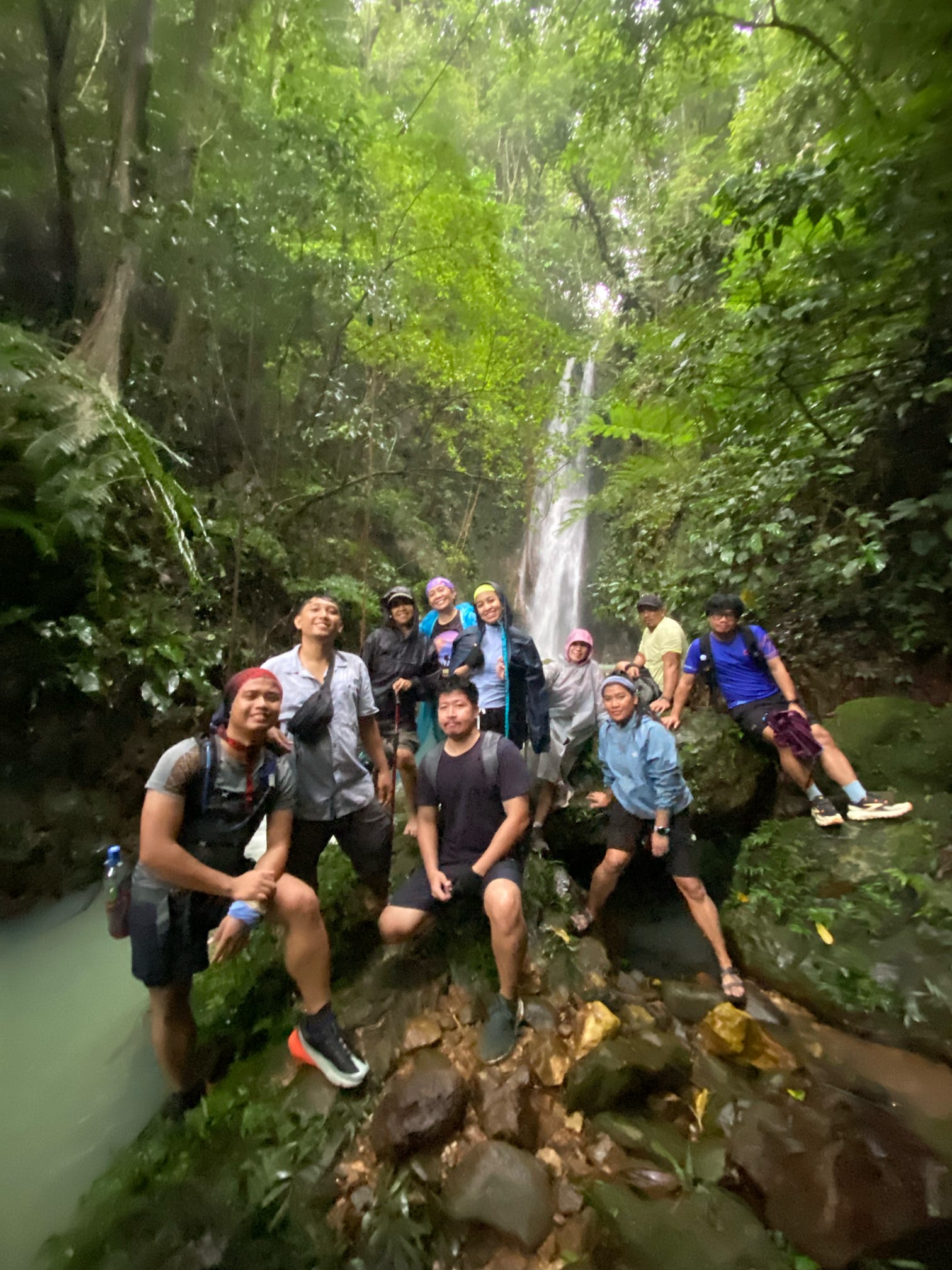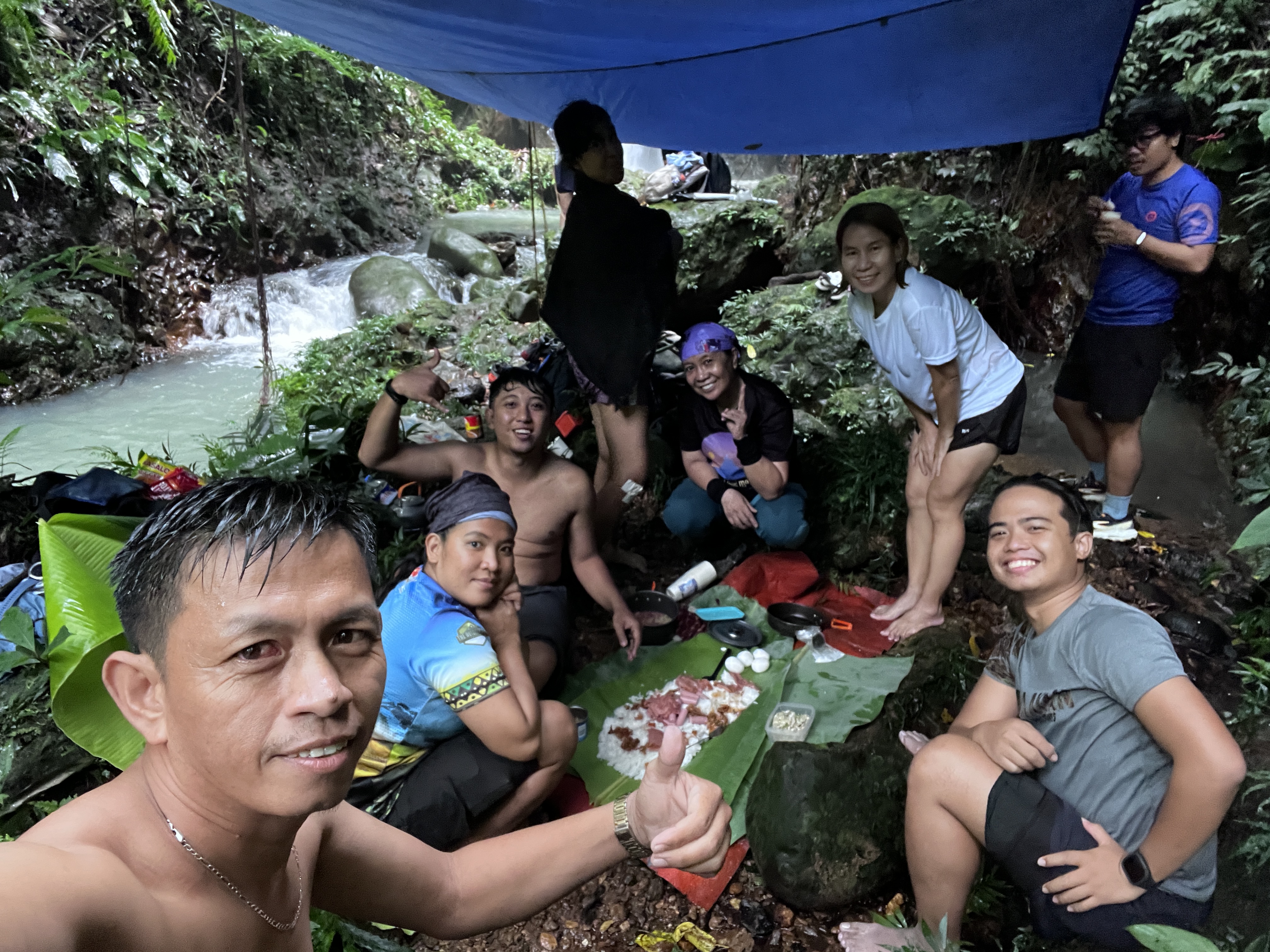 By 11AM, we arrived at the falls. The current was strong and the water cold. Only a few of us were brave enough to swim in the cold water, while the rest of us were just happy to soak our tired feet and legs. They set up a tarp and banana leaves in a spot where we had a mini boodle fight for lunch. We stayed until 2PM before heading to a second peak named Pataguim.